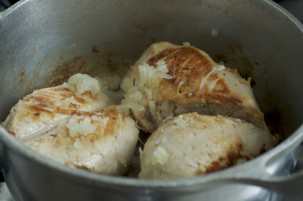 Frite o frango e depois acrescente a cebola