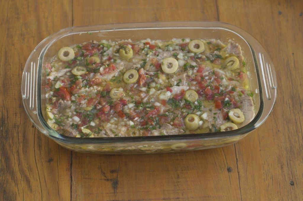 Limpe os camarões e tempere com sal e limão. Deixe de 15 minutos a ½ hora no tempero. Enquanto isto, pique o tomate, a cebola e os pimentões, de modo a dar 1 xícara de café cheia de cada. Pique a salsinha e a cebolinha para dar ½ xícara de café. Deixe as maçãs inteiras por enquanto.