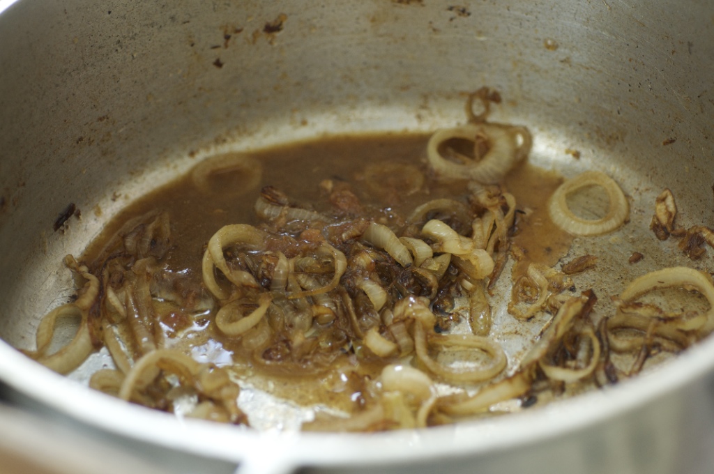 Tire o lombo, faça o caldo com a borra, frite a cebola
