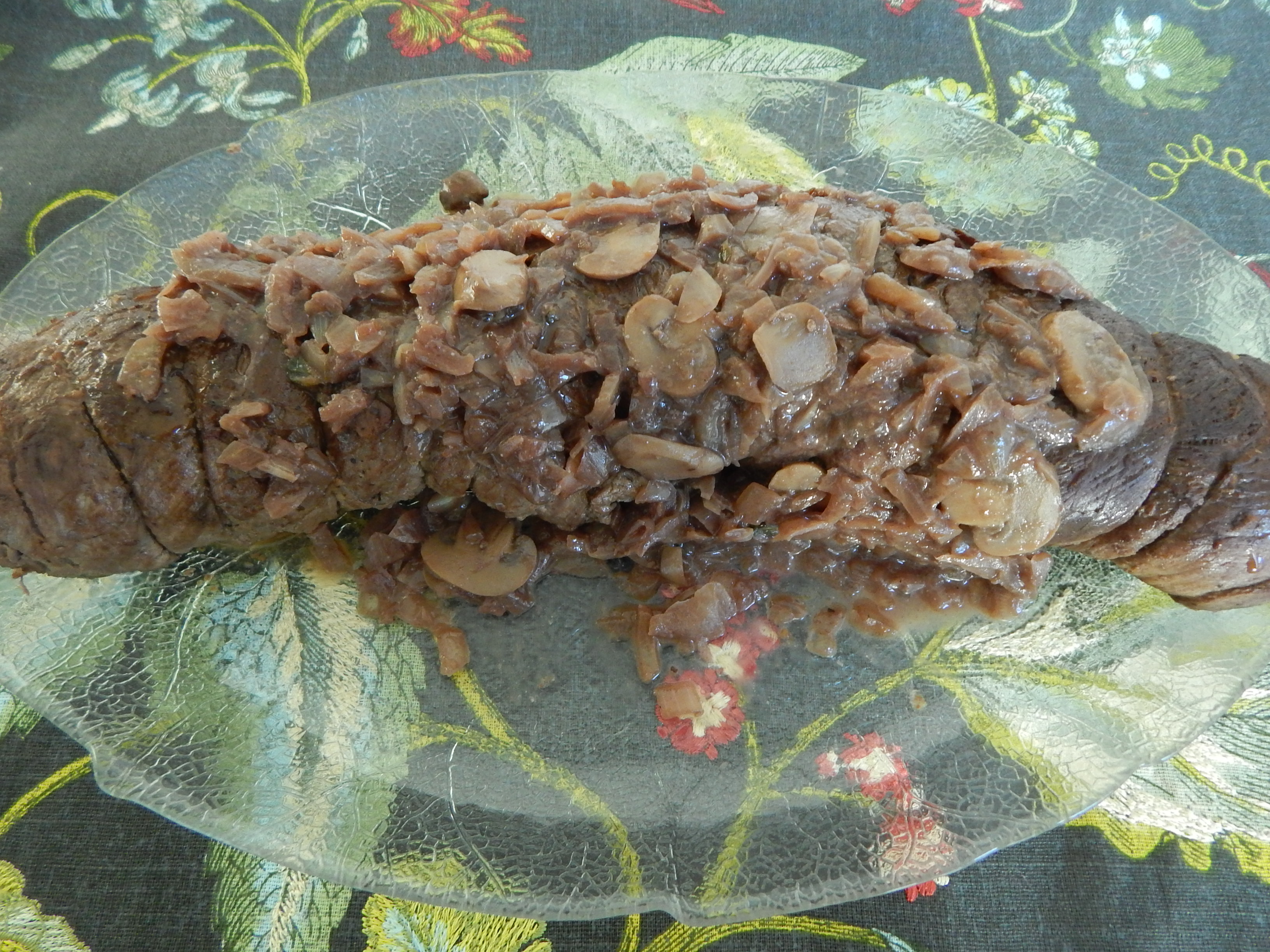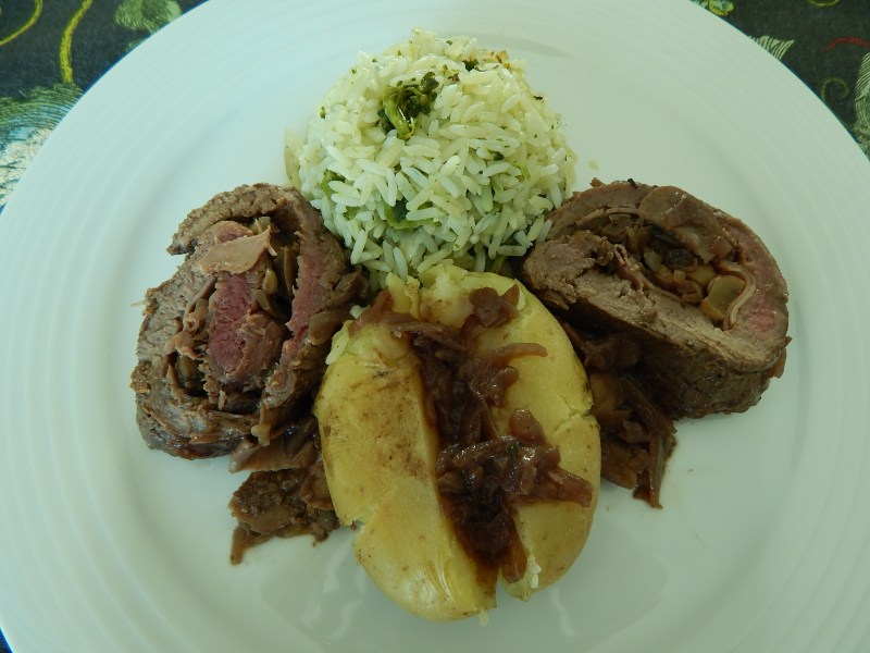 Filé recheado com cogumelo, presunto e frutas vermelhas.