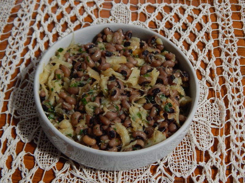 Uma das receitas mais tradicionais de Portugal é esta salada que pode ser servida morna ou fria. O melhor feijão para ser feita é o fradinho – aquele que tem uma pintinha preta.  E deve-se fazer com as sobras do bacalhau, aqueles fiapos que retiramos das beiradas do lombo de bacalhau, que precisam estar bem dessalgadas.