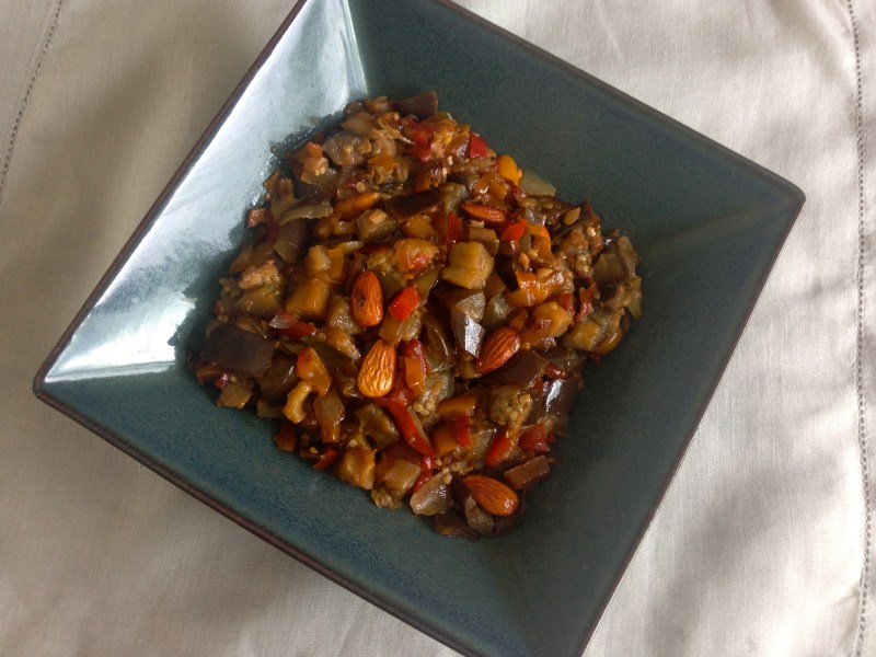 Pique a beringela, os pimentões e a cebola em quadrinhos. Pique o alho bem miudinho. Junte tudo, tempere com os outros ingredientes já misturados à parte.