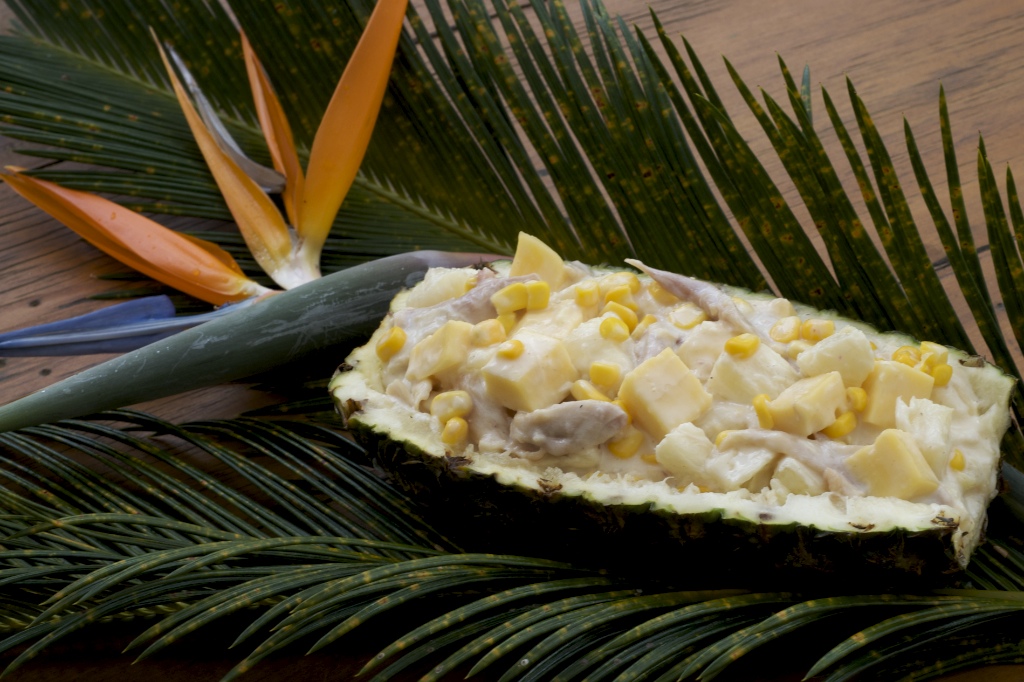 abacaxi, queijo prato, presunto, milho, passa branca  e molho supremo