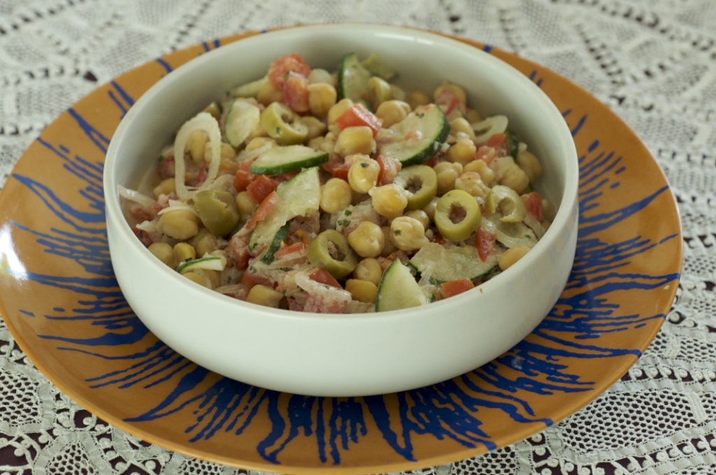 Grão-de-bico, pepino, tomate, cebola, coalhada