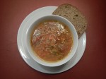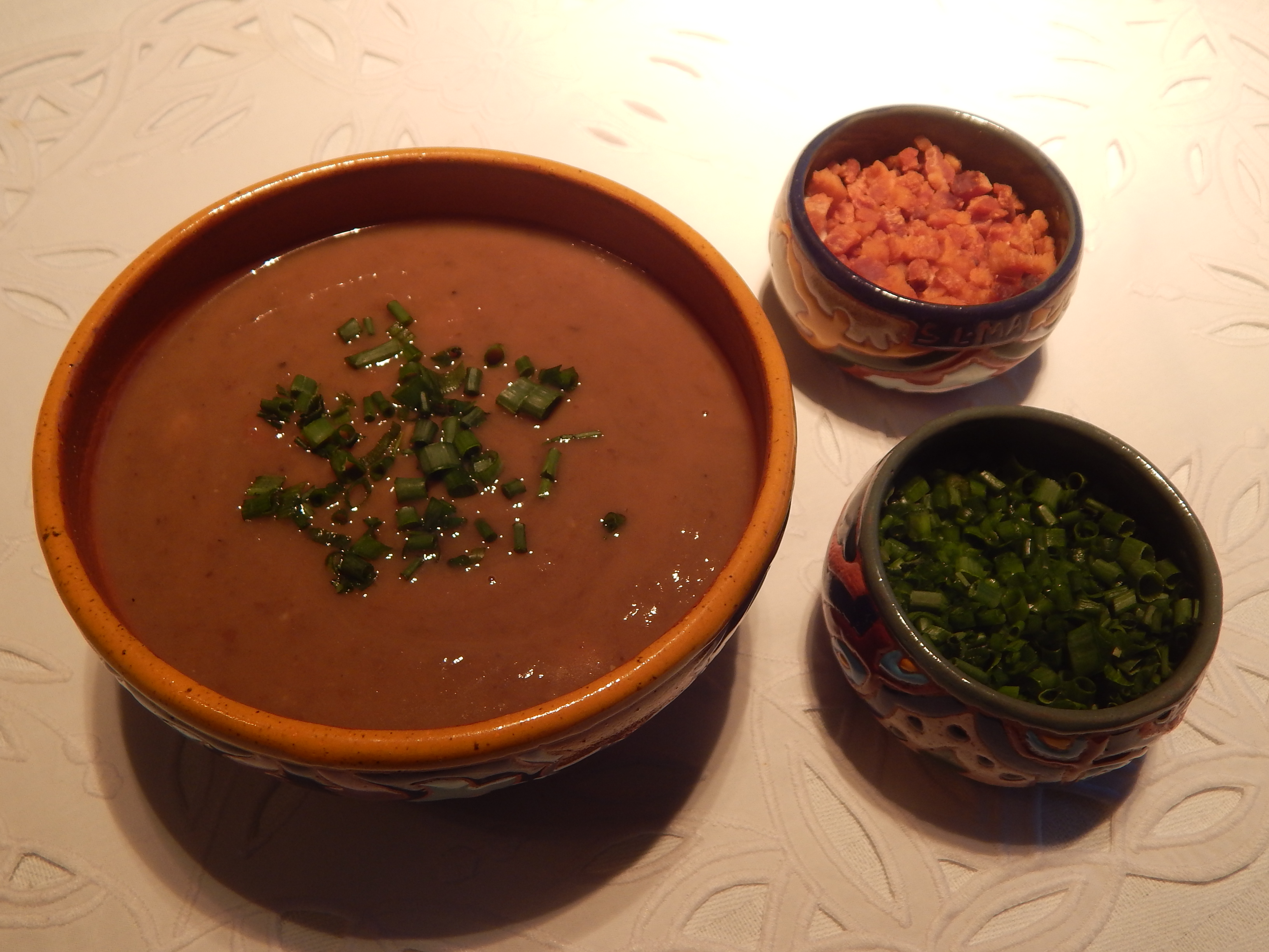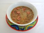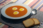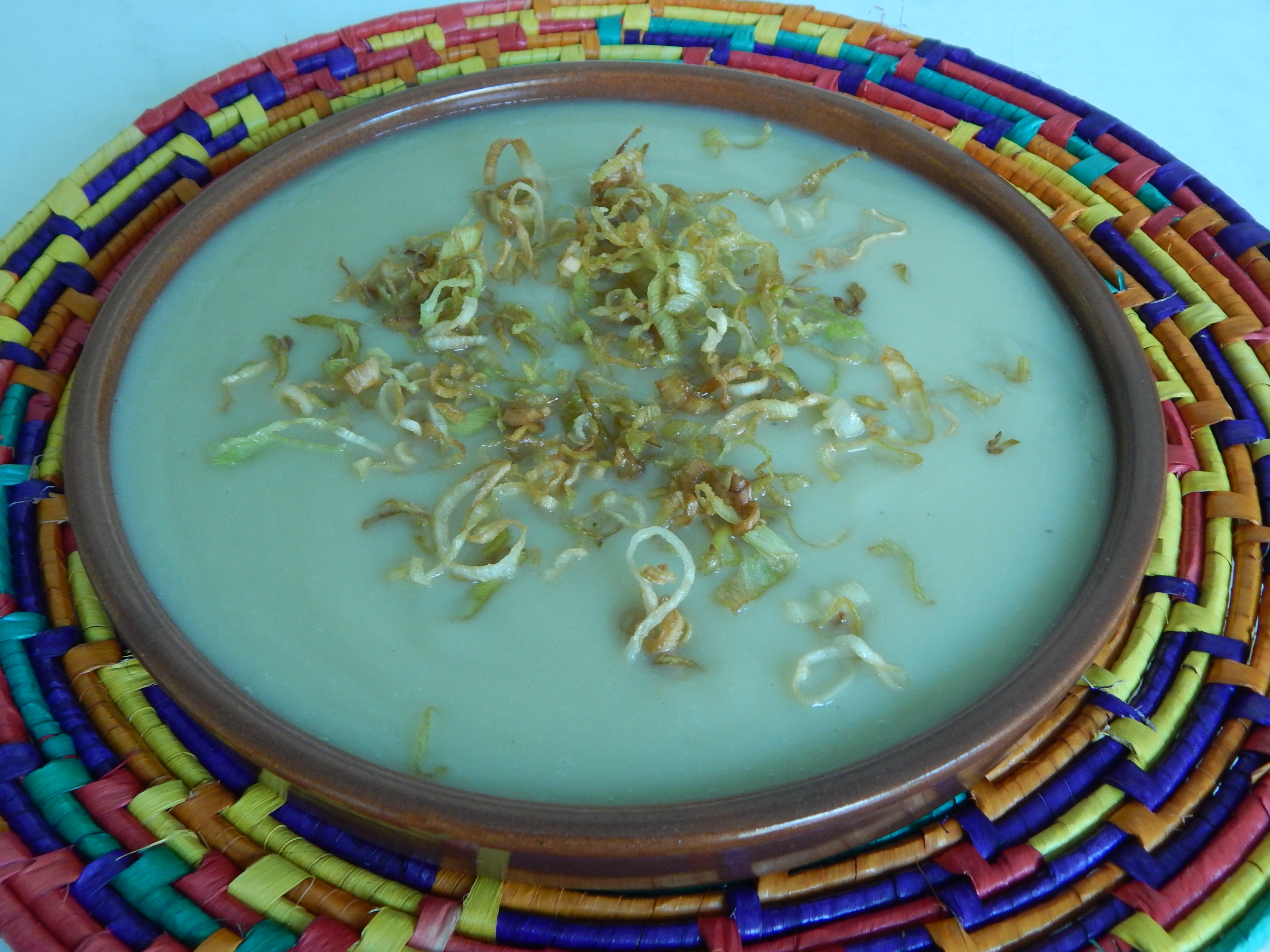 Na mesma panela, acrescente mais azeite, frite a cebola, os pimentões picados e o sal com alho, nessa ordem. Raspe bem o fundo da panela até limpar a borra do camarão (se precisar, pingue água quente). Acrescente a abóbora já cozida, junte água quente (cerca de 2 xícaras), deixe fervendo, em fogo baixo, até que fique tudo bem cozido e abóbora tenha desmanchado. Deixe esfriar um pouquinho e bata no liquidificador até obter um caldo bem homogêneo.