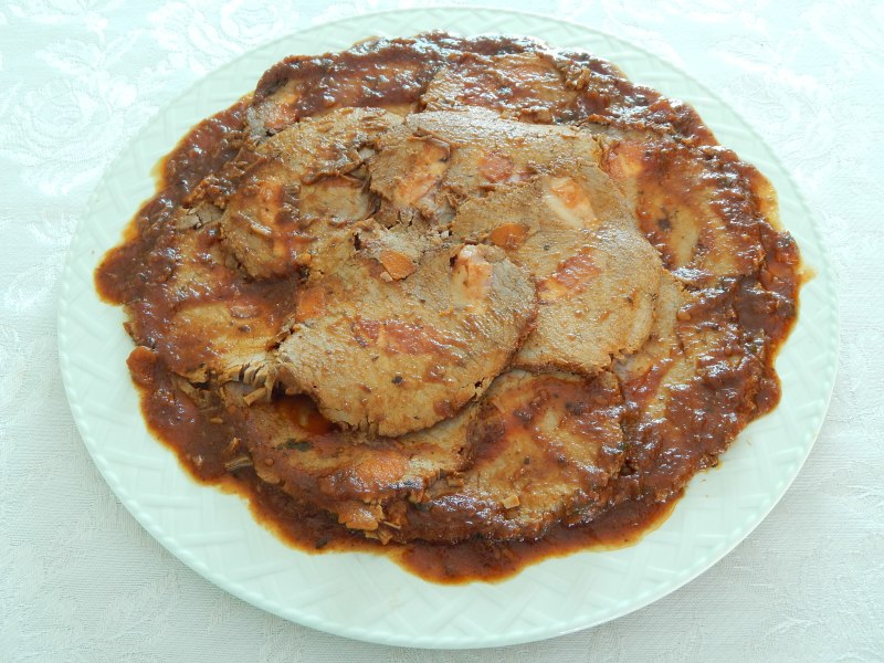 Esquente ½ litro d’água em um caneco. Em uma frigideira, frite o bacon (se for usá-lo) no óleo e em seguida a carne, até ficar corada. Junte a cebola, frite até dourar e depois acrescente o molho de tomates. Vá pingando água quente pelas beiradas até a carne ficar bem macia. Retifique o tempero. Reserve.