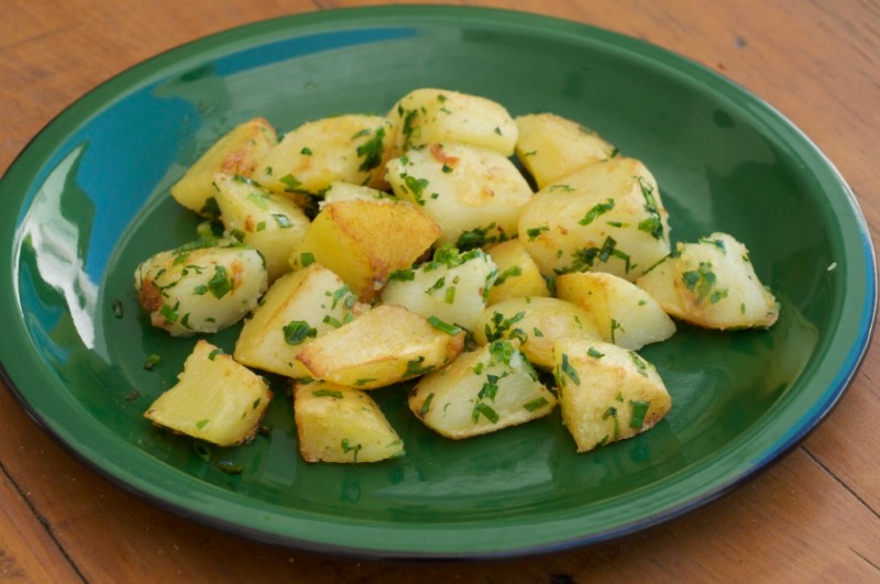 Proceda da mesma forma da receita anterior para fazer a batata. Estando esta pronta, pique as cebolinhas em quatro e frite ou asse-as com pouco azeite e um tiquinho de sal. Depois junte-as às batatas.