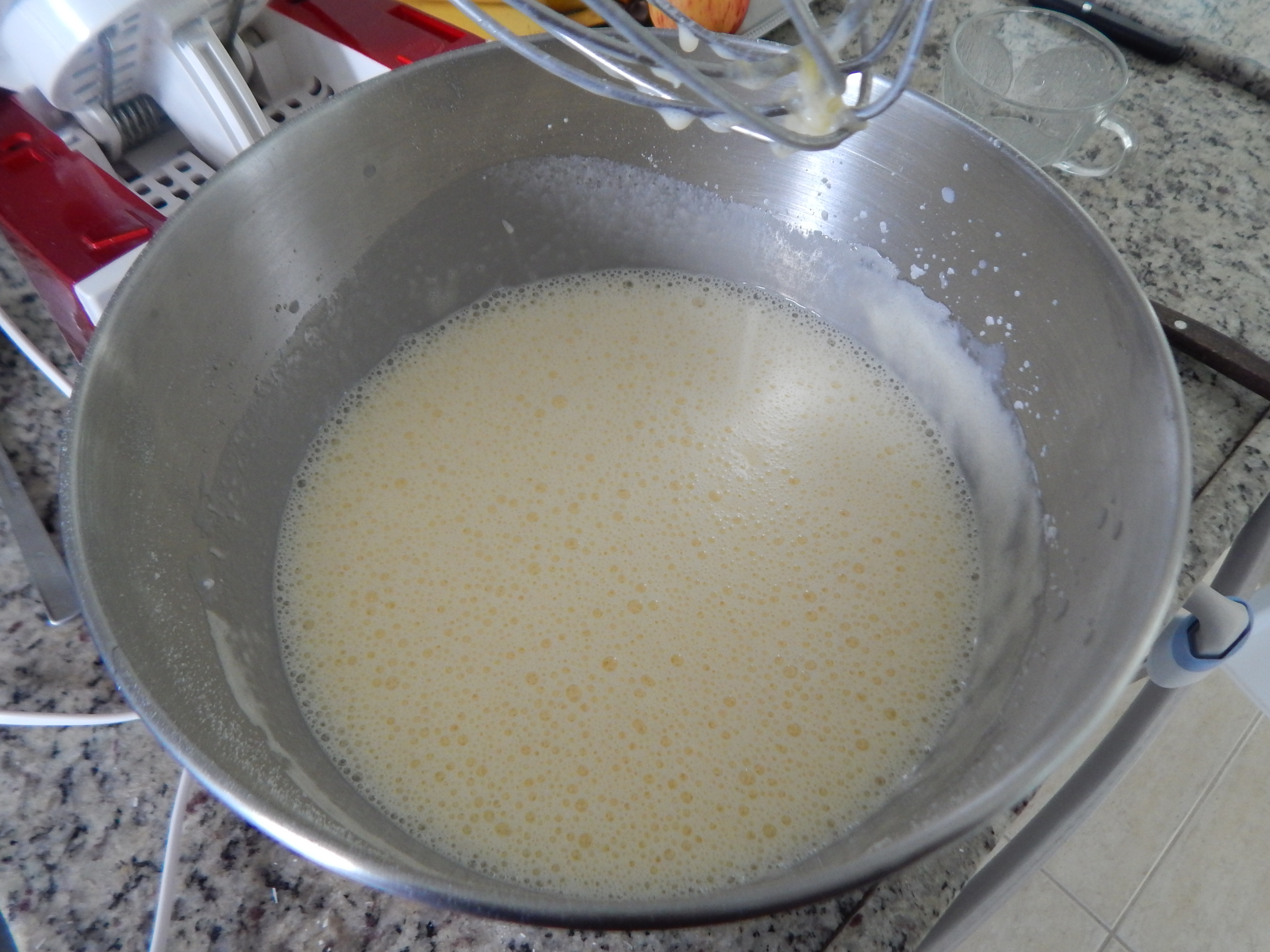 Bata os ovos com o açucar e junte o leite de coco