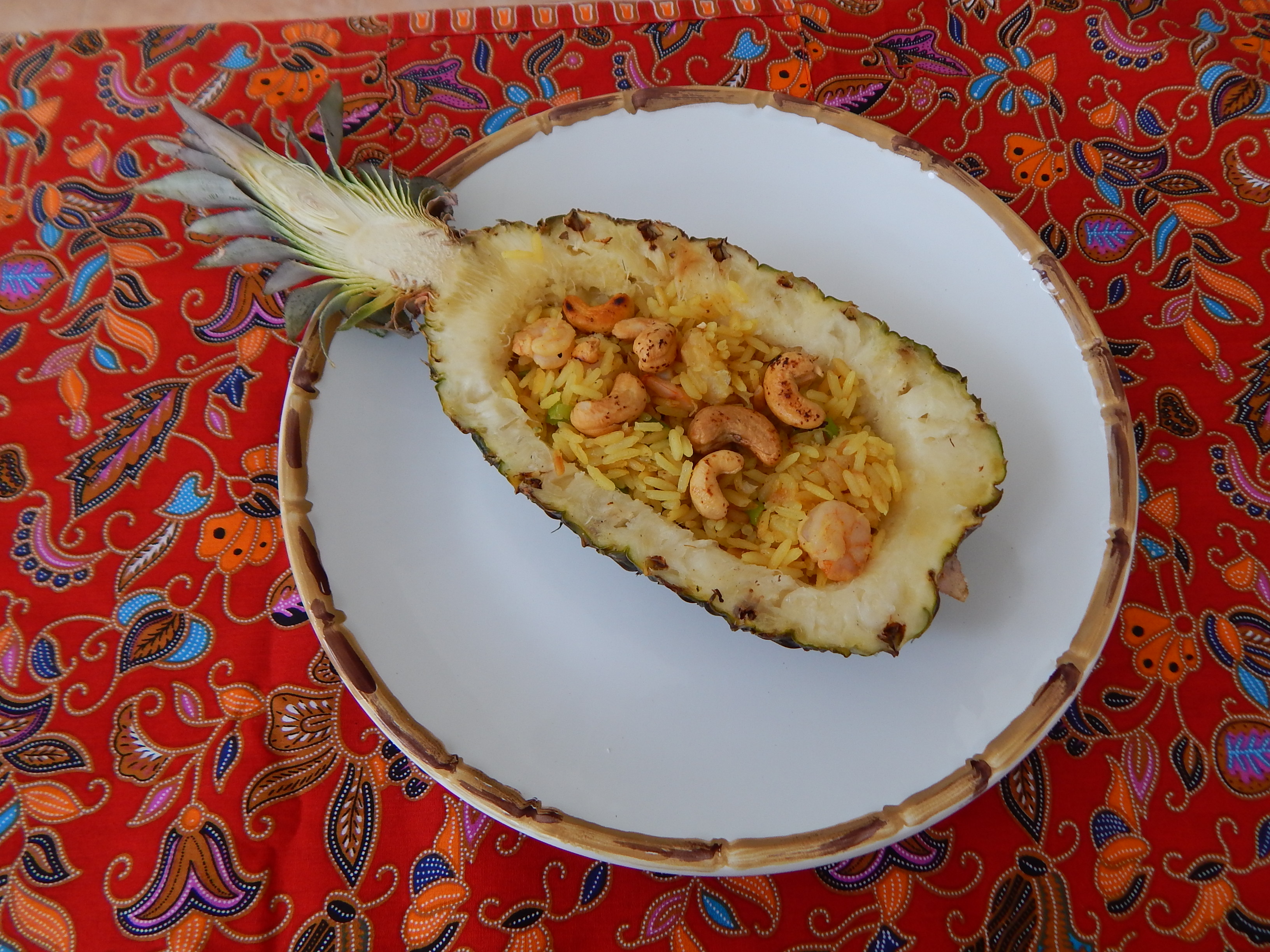 Junte o camarão, recheie o abacaxi e espalhe as castanhas