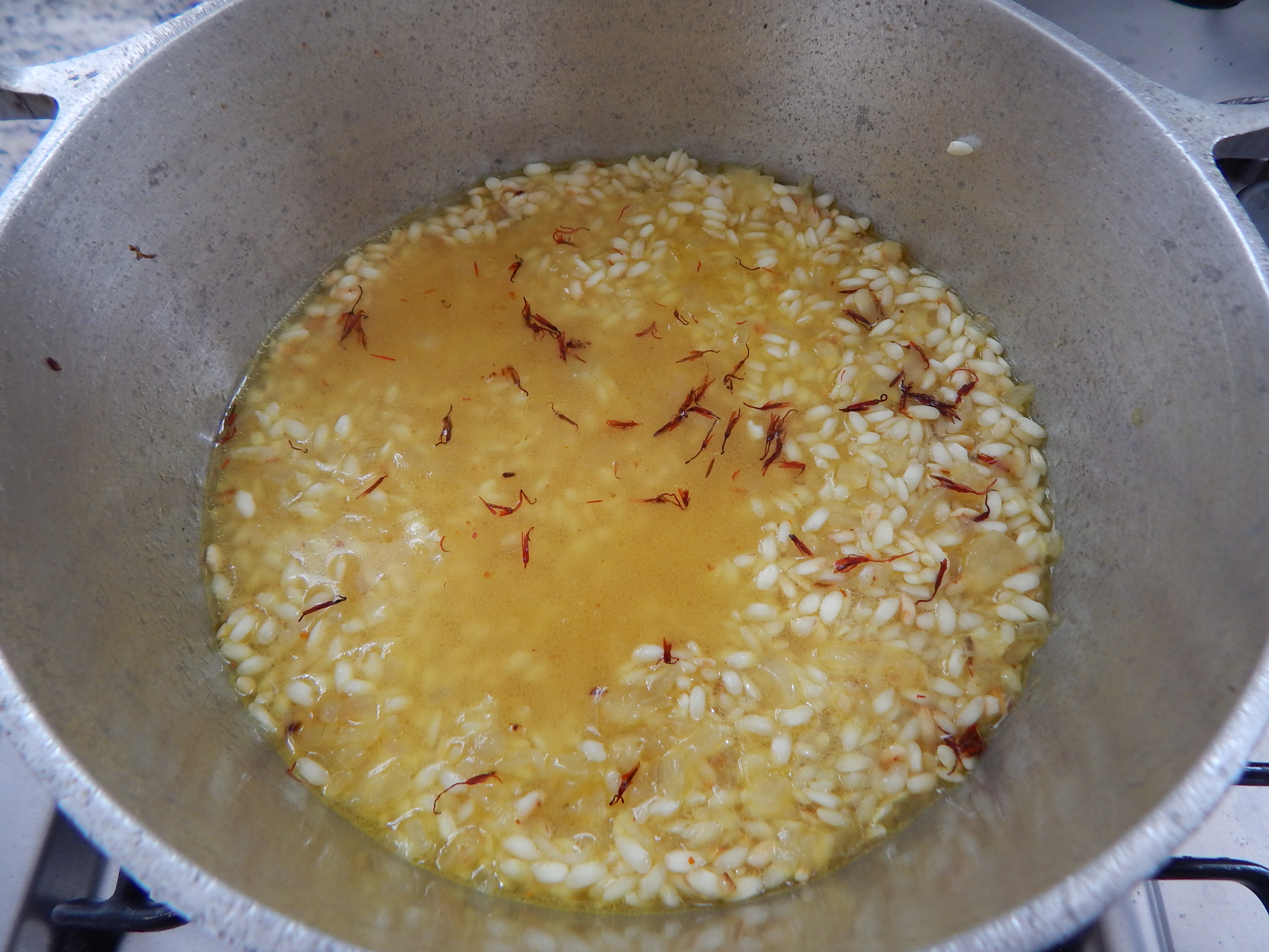 Junte o caldo e o açafrão