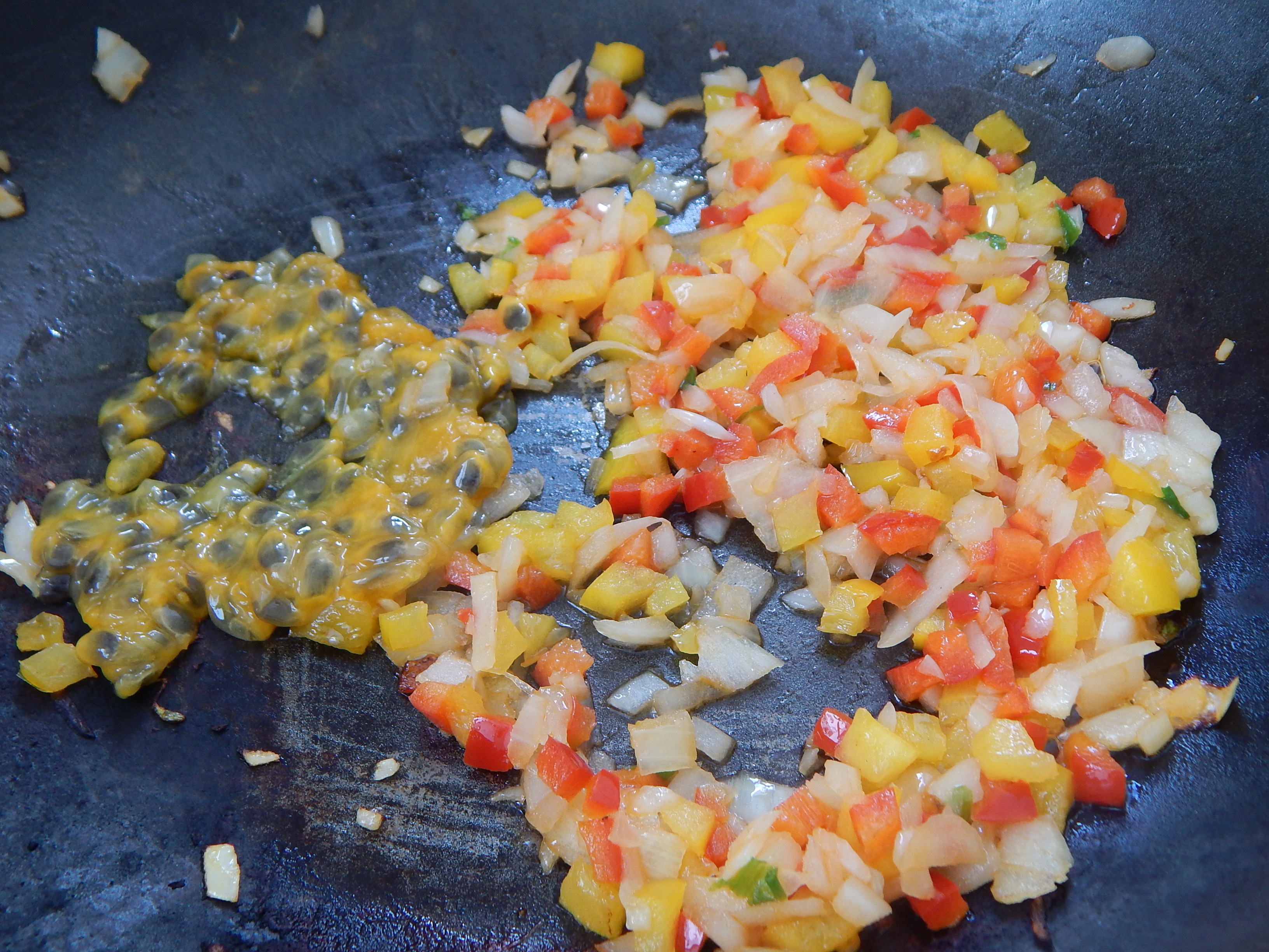 Frite pimentões e cebola e a polpa do maracujá separados