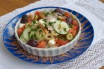 tomate, pepino, cebola roxa, queijo feta, azeitona preta e hortelã