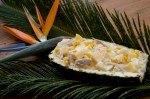 abacaxi, queijo prato, presunto, milho, passa branca e molho supremo