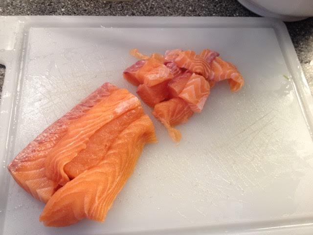 Salmão cortado em cubos
