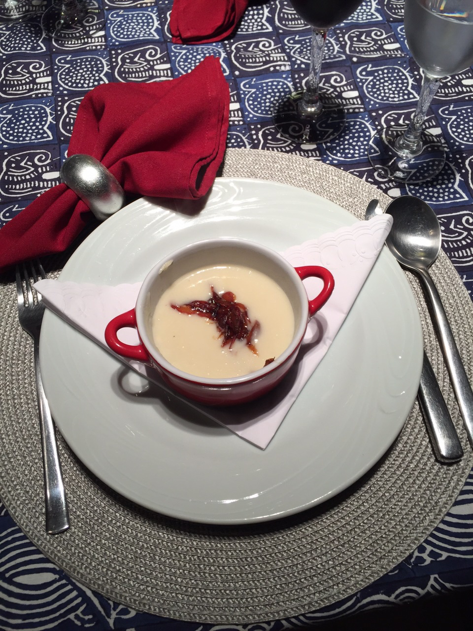 Ingredientes para o molho de abacaxi: 1 colher de sopa de manteiga (pode ser azeite), 1/2 cebola roxa e 1 dente de alho picadinhos. 1/3 de pimentão vermelho e 1/3 de pimentão amarelo (retire as sementes e as partes brancas) cortados bem miudinhos, 1 abacaxi descascado e cortado em cubinhos (retire o centro), 2 maçãs fuji sem casca e cortadas em cubinhos. 1/2 copo de vinho branco, 1/2 xícara de açúcar mascavo, 1 limão siciliano, 1 colher de chá de gengibre, 1/2 colher de chá de curry. 3/4 de xícara de uva passa preta, 5 fatias de presunto parma. Pimenta do reino branca a gosto.