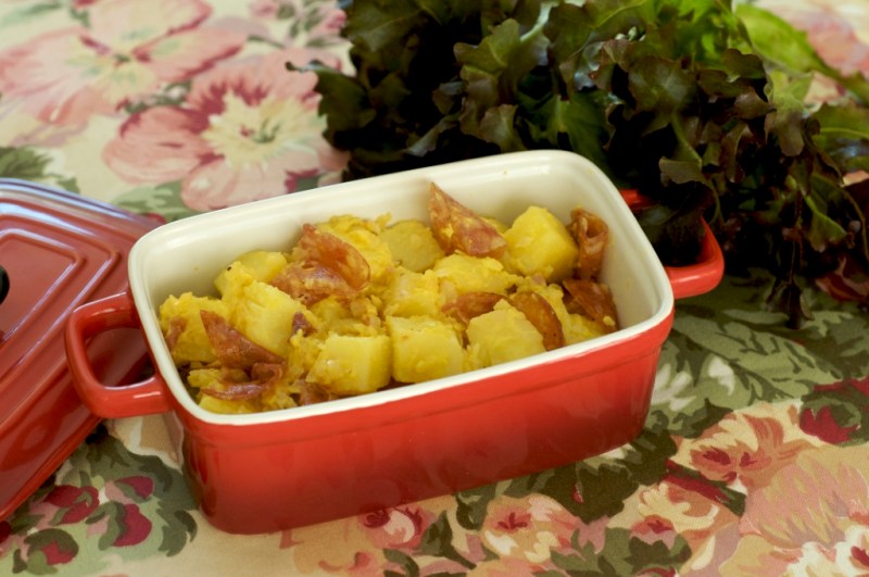Cozinhe as batatas ao dente, despele e corte em cubos.  Frite a cebola e o bacon picadinhos em um fio de azeite. Tire do fogo, junte os cubos de batata e mexa com cuidado. Junte o salaminho (ou outro ingrediente que escolher), acrescente o molho e misture com cuidado para não desmanchar a batata.