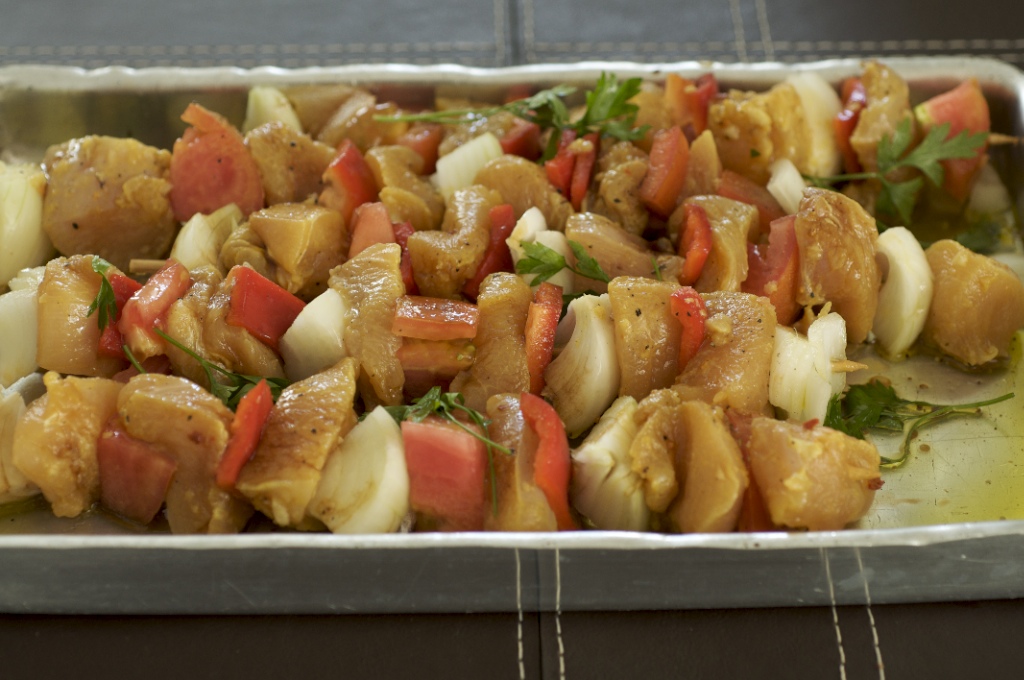 Limpe o peito de frango e corte-o bem miudinho, como se fosse moído. Tempere com sal, alho e pimenta. Deixe 15 minutos no tempero enquanto pica os outros ingredientes.