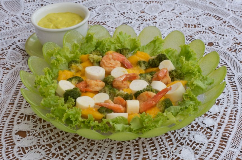 Brócolis, palmito, manga e kani com molho de iogurte e manga
