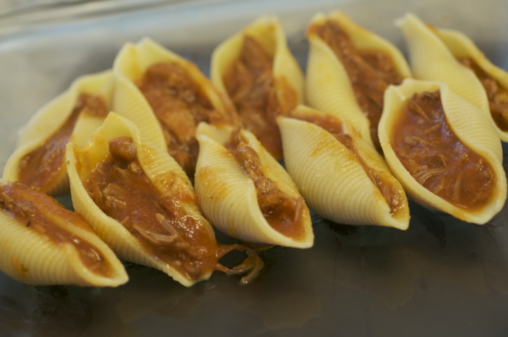 Tome uma  travessa refratária ou um pirex de vidro temperado. Forre todo o fundo com uma camada do molho.  Pegue uma colher de chá para rechear e, à medida que for recheando as conchas, coloque-as na travessa. Depois que estiver completa, preencha os buracos e cubra com o restante do molho. Se quiser, espalhe queijo ralado tipo parmesão ou pecorino por cima. Leve ao forno até verificar que o molho está fervendo.