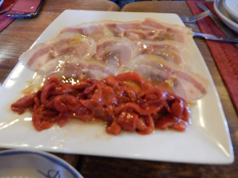 Em um dos salões do luxuoso restaurante fomos anfitrionadas pelo famoso Prada a Tope – um homem alegre, afável e divertido. Uma equipe muito atenciosa e simpática serviu-nos preciosos vinhos e várias entradas, entre as quais queijo de cabra com geleia de pimentão, foie gras com geleias de marmelo e de figo, carpaccio de cecina e lacón com pimentões assados ( foto principal)